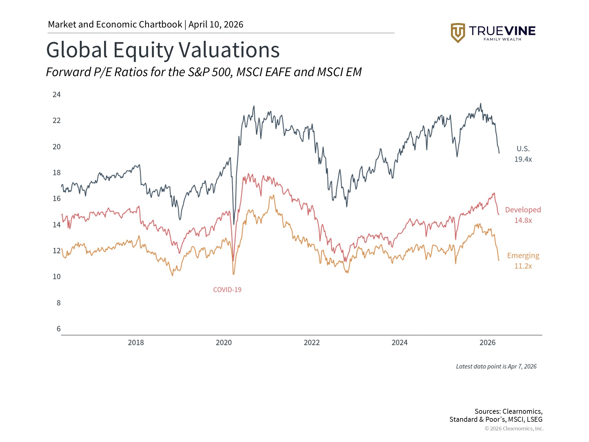International stocks also look more affordable compared to U.S. stocks. Developed markets trade at a price-to-earnings ratio (a common measure of how expensive a stock is relative to its earnings) of 14.9x and emerging markets at 11.8x, compared to 19.9x for the S&P 500. While this doesn’t predict short-term returns, it’s a useful input when building a balanced portfolio. So far in 2026, international markets have continued to modestly outperform U.S. stocks, reinforcing the case for maintaining global diversification.