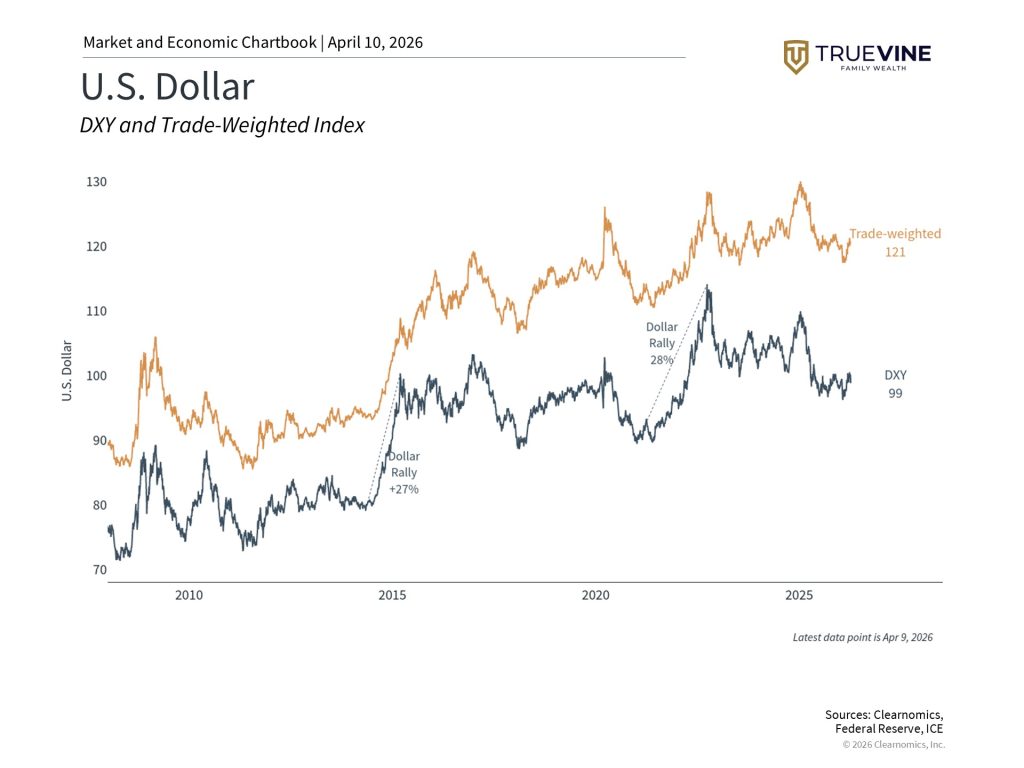 After peaking around 114 on the dollar index (DXY) in 2022, the dollar weakened as global growth stabilized. Tariffs pushed it below 100 for the first time in three years, though it has since partially recovered. Even with the decline, the dollar remains stronger than its long-term historical average.