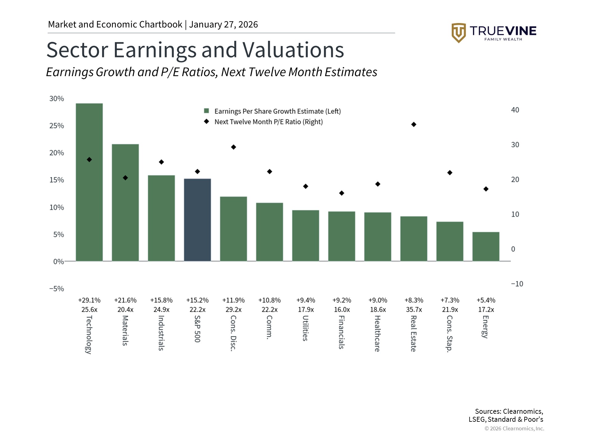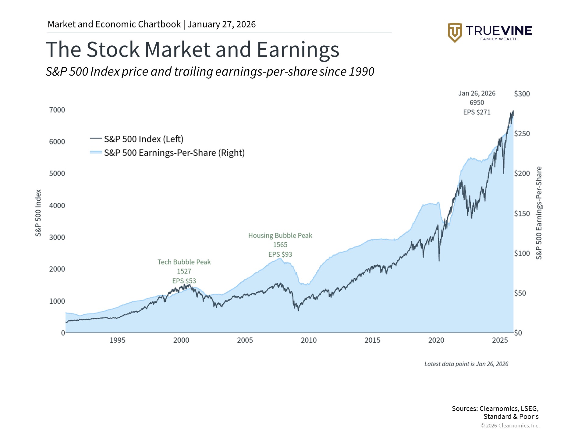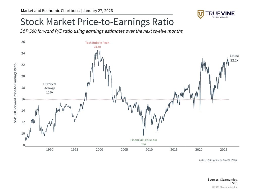 Last year, the S&P 500 rose 16.4%. About 80% of that gain came from earnings growth, while only 20% came from investors paying higher prices. This means portfolios have done well mainly because companies performed better, not just because investors were willing to pay more. However, when valuations are high, the market can swing more dramatically during uncertain times. This doesn’t mean you should avoid stocks, but it does highlight the importance of managing risk in your portfolio. Contact TrueVine Family Wealth to discuss your financial goals today.